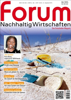 Jeder Bundesbürger verbraucht durchschnittlich 117 Kilogramm Kunststoff pro Jahr. Mehr als ein Drittel davon sind Verpackungen. Wissenschaftler gehen davon aus, dass 10 Prozent aller weltweit hergestellten Kunststoffe (299 Millionen Tonnen im Jahr) früher oder später in die Ozeane eingetragen werden oder deren Strände vermüllen. 30 Millionen Tonnen Plastik landen somit rechnerisch pro Jahr im Meer. Die Lösungen? Großtechnische Anlagen wie in den Konzepten von Pacific Garbage Screening oder The Ocean Cleanup sollen den Müll wieder aus den Meeren fischen und verwerten. Gemeinsam mit den Experten der GEOMAR Meeresforschung in Kiel zeigt forum, welche Aktionen Sinn machen und was Science Fiction ist. Den Machern von forum ist auch mit dieser Ausgabe ein interessanter Themenmix gelungen: Von Biokunststoffen bis zu Plastik im Meer, von der ISO-Revision bis hin zu modernem Wassermanagement, von Kunst und Nachhaltigkeit bis zu starken Frauen reicht das Themenspektrum. Per Anhalter durch das Geldsystem Begleiten Sie den Filmemacher Philipp Endres bei seiner spannenden Reise durch unser Geldsystem, besuchen Sie die Hüter der Erde in Kolumbien und werfen Sie mit forum-Autor Christoph Quarch einen Blick hinter die Kulissen der EXPO in Mailand. Außerdem in forum: